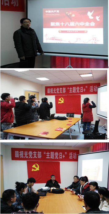 会议由眼视光公司党支部书记操盛春同志主持,共有六项议程。会议伊始,全体起立,高声齐唱国歌,促进全体党员的爱国热情,交纳党费,重温入党誓词、诵读党章,接着大家一起深入学习党章党规、习近平总书记系列重要讲话精神和治国理政新理念新思想新战略,党员们凝神静听,领悟精神。然后党总支书记范杉同志为党员们上题为“聚焦十八届六中全会”的微党课,他指出各级干部都要提高党员思想认识水平,增强“四个意识”,树立和发扬好的作风,严以修身、严以用权、严以律己,做让党放心,让人民满意的好干部!接着通报2016年底班子民主生活会、支部组织生活会和党员民主测评情况,继续听取各方面意见和建议,充分发扬民主,提高党组织的战斗力。最后民主议事阶段,党员们积极为2017年“主题党日+”活动计划建言献策,依据我们支部的特点,可以联合医院员工一起组织多样化的联谊和主题党日活动。操盛春同志还通报了支部2016年底组织生活会和党员民主测评情况。