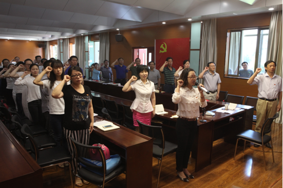 全体党员在嘹亮的国歌合唱声中拉开“主题党日+”活动的序幕,坚定而铿锵的歌声在会议室激扬回荡。交纳党费,重温誓词,诵读党章,“六事联动”活动规范且有序进行,严谨而又严肃。