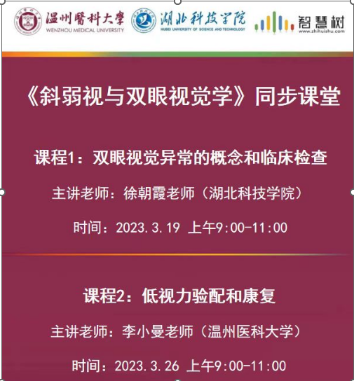 (通讯员:徐朝霞) 为深入推进教学改革创新,进一步加深校际合作交流,继3月19日公司与温州医科大学开展《斜弱视与双眼视觉学》同步课堂之后,3月26日两校再次开展第二次同步课堂教学,此次课程内容为低视力康复与验配,主讲老师温州医科大学李小曼老师与意昂体育徐朝霞老师一起,给同学们呈现了一堂内容丰富、互动频繁的精彩课堂。
