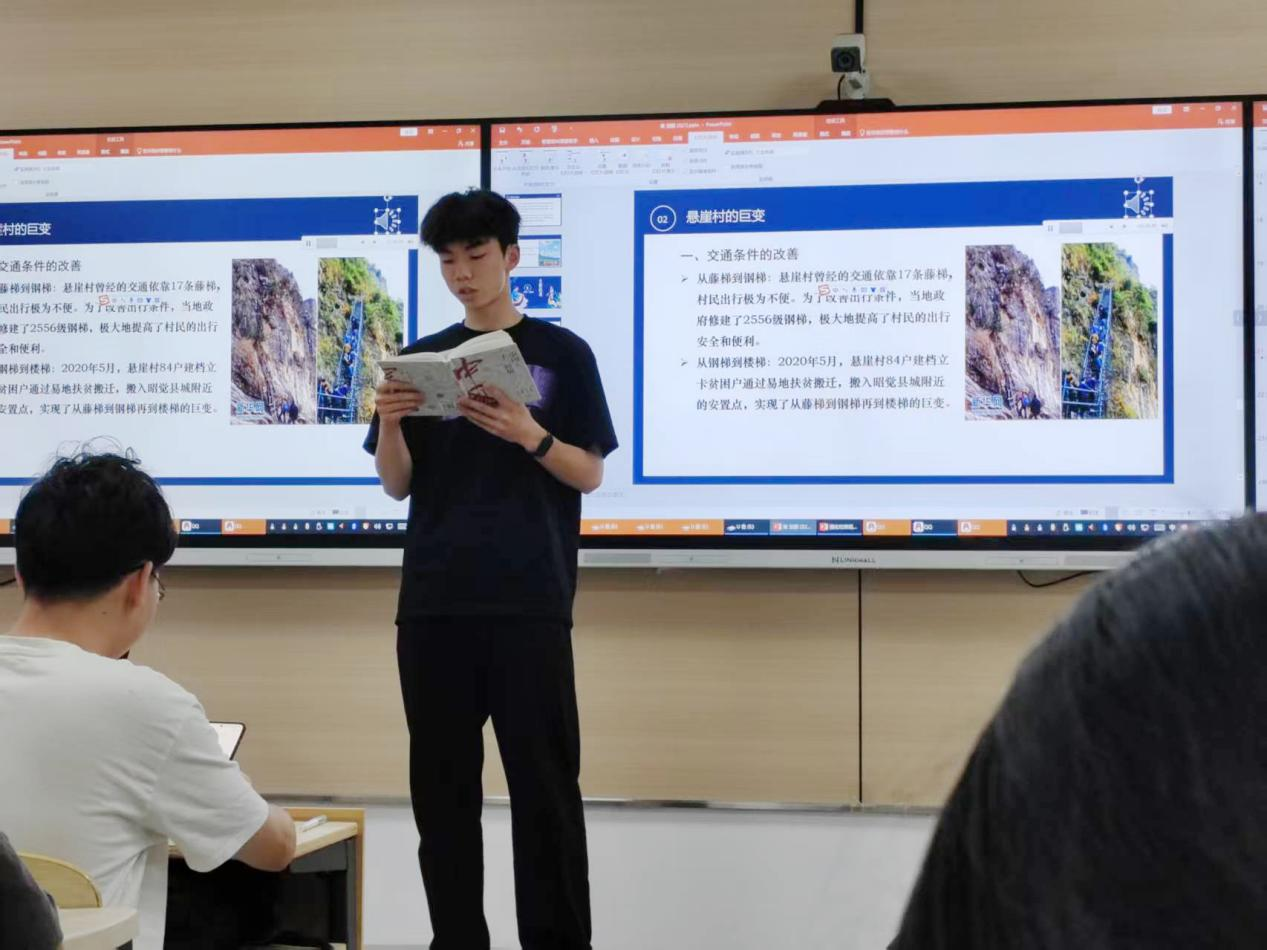 “悬崖村钢梯取代藤梯,人均年收入从2000元跃至1.2万元;彝家新寨建成后,儿童入学率达99.7%……”主讲人蔡儒鹏同学用一组数据剖开脱贫奇迹的肌理。当纪录片《钢梯上的曙光》播放时,三代彝人的命运跃然眼前:祖父背篓运货日挣15元,父亲经营民宿年入8万,女儿成为全村首位老员工。“守护家乡也能创造价值!”片中人的肺腑之言引发掌声雷动。“脱贫攻坚不是抹平差异,而是让文明成为时代的注脚。”蔡儒鹏同学引用书中文句,将话题引向更深层的思考。