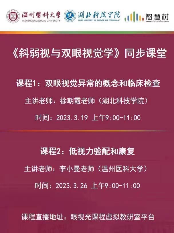 各位老师好,眼视光课程虚拟教研室3月份(19日上午、26日上午)将有两堂《斜弱视与双眼视觉学》同步课堂,详见上图,烦请老师们转发各自公司相关课程老师,欢迎老师们登录虚拟教研室平台,观看直播。