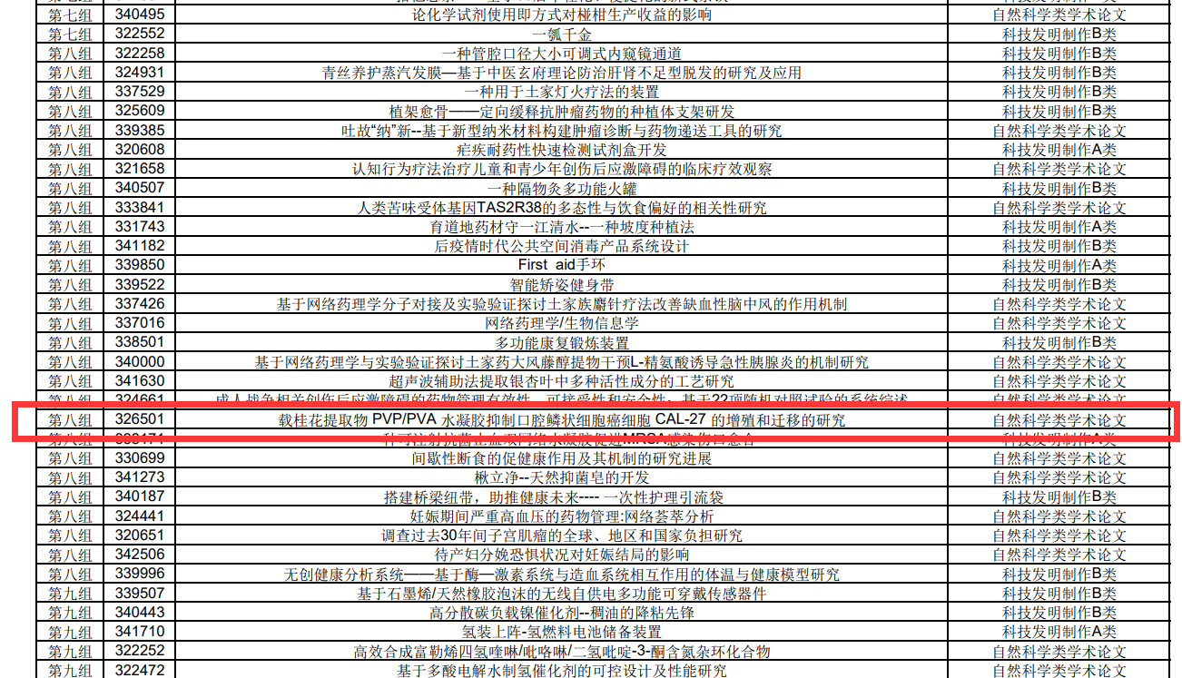 (通讯员 陈黄琴)近日,我省第十四届全国老员工课外学术科技作品竞赛落下帷幕。公司吴池洲等同学撰写的自然科学类学术论文《载桂花提取物PVP/PVA水凝胶抑制口腔鳞状细胞癌细胞CAL-27的增殖和迁移的研究》获得省级三等奖(指导老师:陈黄琴,黄彬)。